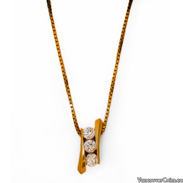 One cast and hand finished 14 karat yellow gold slide pendant of contemporary design consisting of a contoured frame measuring approximately 19.7mm by 7.8mm. The front of the pendant forms a channel setting for the diamonds described in detail below. The pendant suspends on a medium/fine gauge 14 karat yellow gold box link chain 1.1mm wide measuring 20 inches in length secured by a lobster catch.