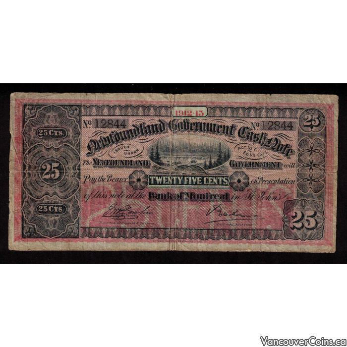 1912-13 Newfoundland 25 cents banknote VG reverse fold lines