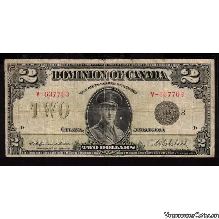 1923 Canada $2 dollar note Campbell Clark V-637763 black seal-4 FINE+