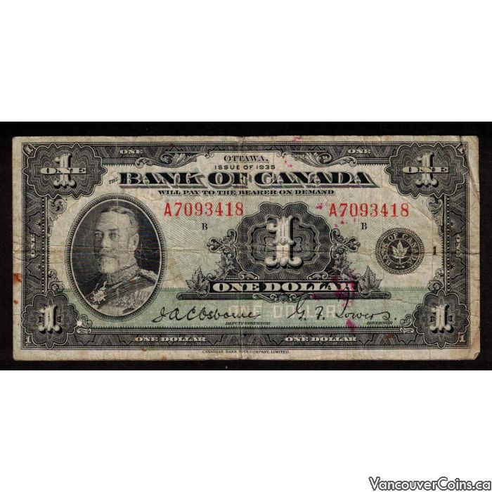 1935 Canada $1 banknote A7093418 G/VG damaged