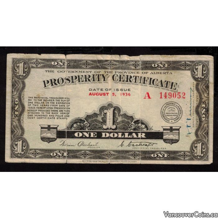 1936 Alberta $1 Prosperity Certificate Note A149052 Fine
