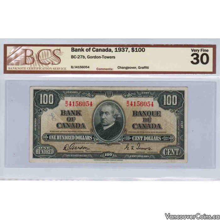 1937 Bank of Canada $100 VF-30 B/J Gordon/Towers BC-27b