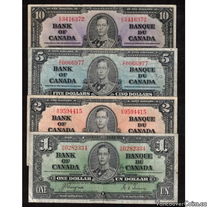 1937 Canada $1 $2 $5 $10 banknote set mixed signatures and prefix all FINE