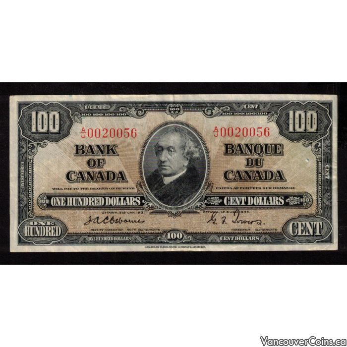 1937 Canada $100 banknote Osborne Towers A/J 0020056 nice VF+