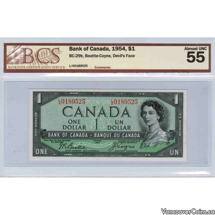 1954 Bank of Canada $1.00 AU-55 L/A Beattie/Coyne "Devil's Face" BC-29b