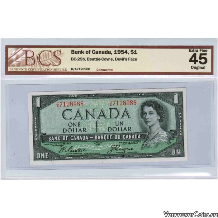 1954 Bank of Canada $1.00 EF-45 R/A "Devil's Face" BC-29b