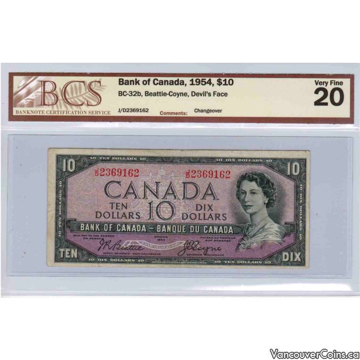 1954 Bank of Canada $10 Devils Face J/D BC-32b BCS VF20 changeover