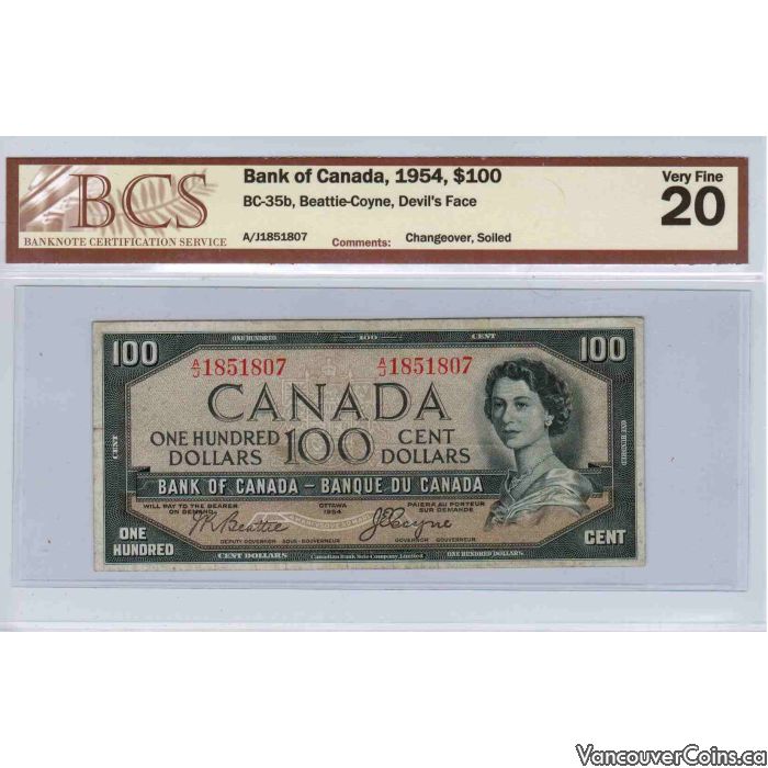 1954 Bank of Canada $100 VF-20 A/J "Devil's Face" BC-35b Beattie/Coyne "Changeover"