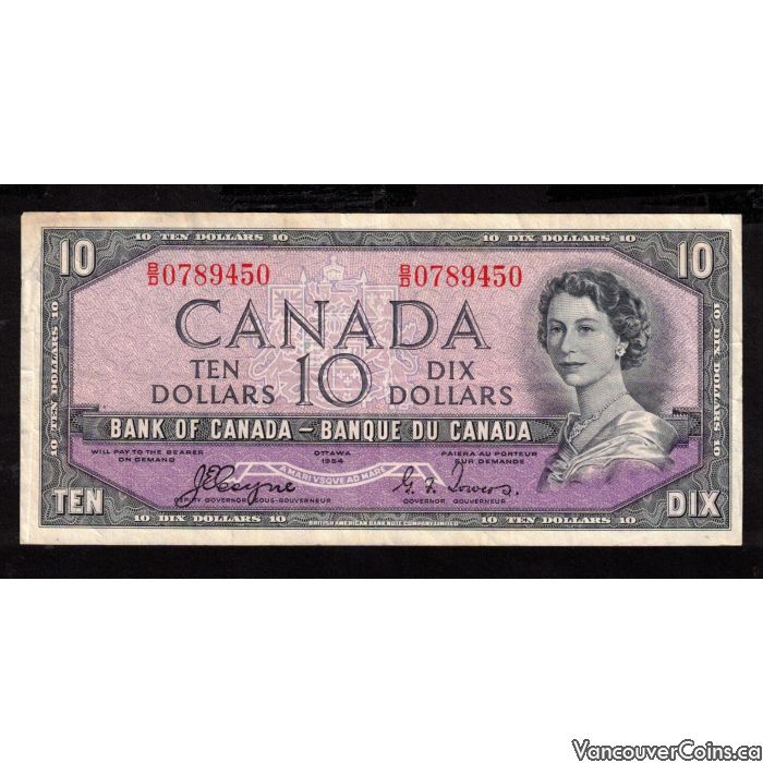 This 1954 Canadian Devils Face $10 banknote with Coyne-Towers signatures and B/D prefix.