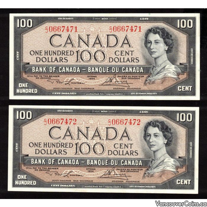 1954 Canada $100 2-consecutive notes Lawson Bouey C/J 0667471-72 CH AU