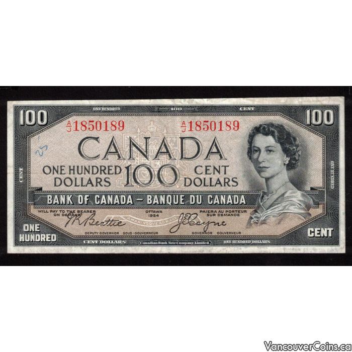 1954 Canada $100 devils face banknote Beattie Coyne A/J 1850189 VF
