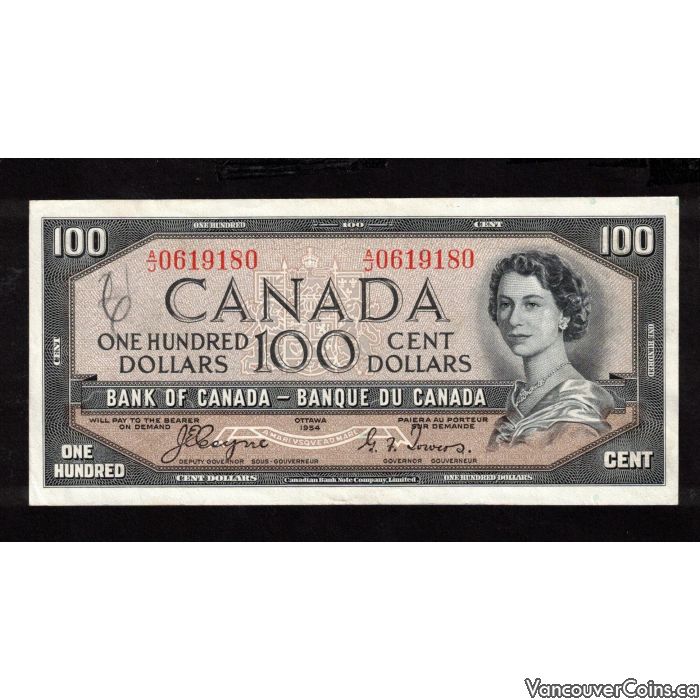 This is a 1954 Canadian Devils Face $100 banknote with Coyne Towers signatures and A/J prefix, in AU/UNC condition.