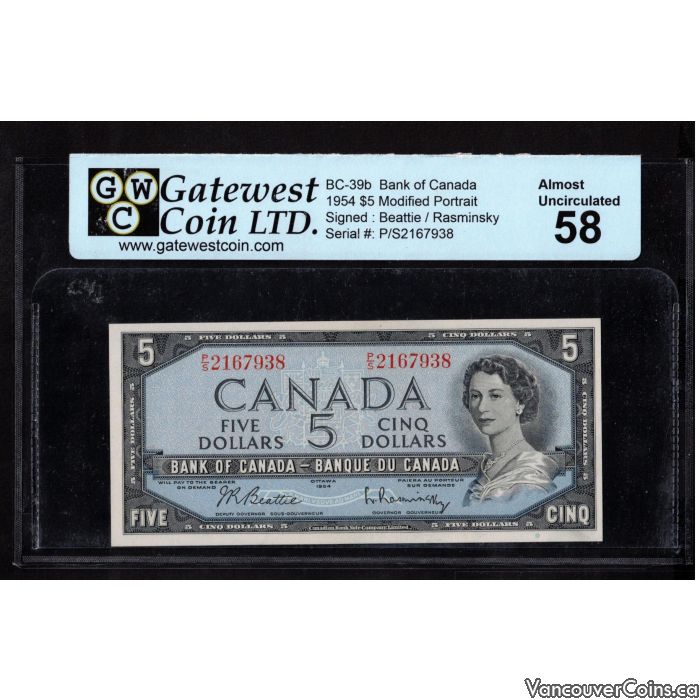 1954 Canada $5 banknote Beattie Rasminsky P/S 2167938 GATEWEST AU58