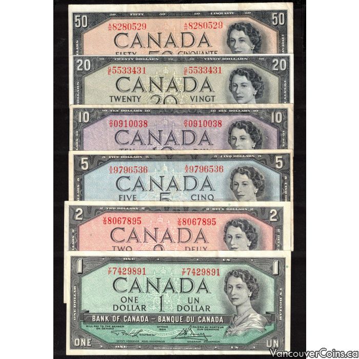 1954 Canada 6-note set $1 to $50 Beattie Coyne Lawson Bouey Rasminsky VF+