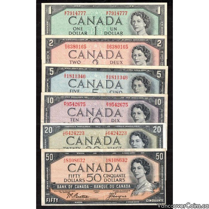1954 Canada 6-note set $1 to $50 Beattie Coyne Lawson Bouey Rasminsky VF+