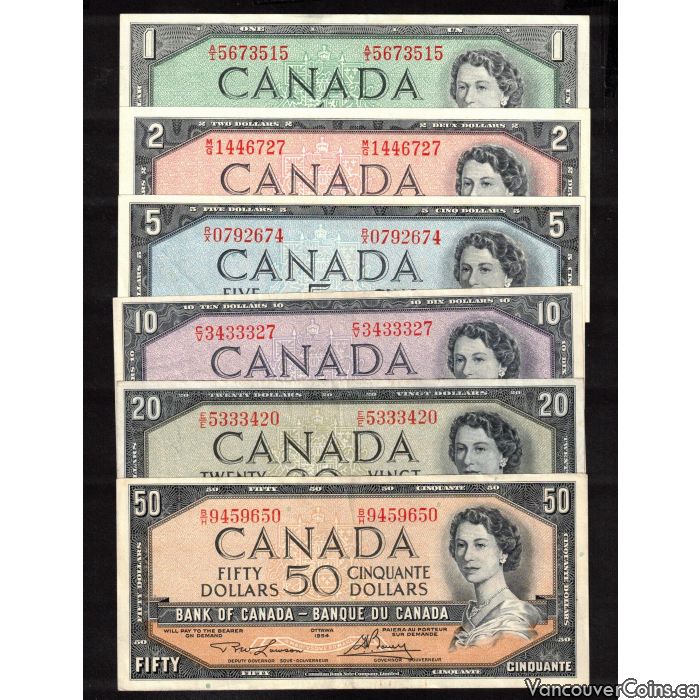 1954 Canada 6-note set $1 to $50 Beattie Coyne Lawson Bouey Rasminsky VF+