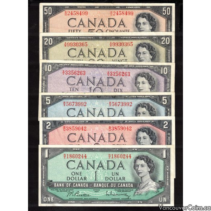 1954 Canada 6-note set $1 to $50 Beattie Rasminsky VF+
