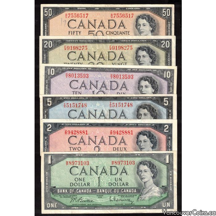 1954 Canada 6-note set $1 to $50 Beattie Rasminsky VF