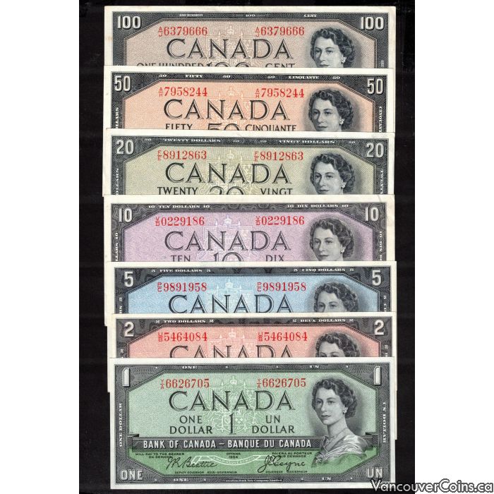 1954 Canada note set $1 $2 $5 $10 $20 $50 $100 Beattie Coyne EF+/AU+