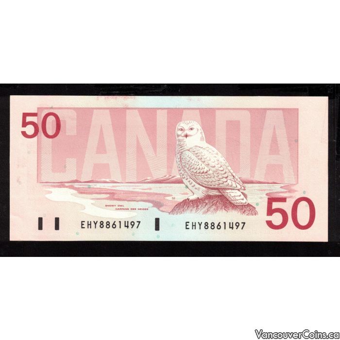 1988 Canadian $50 banknote from the Birds of Canada series, featuring snowy owl and Mackenzie King portrait with EHY prefix.