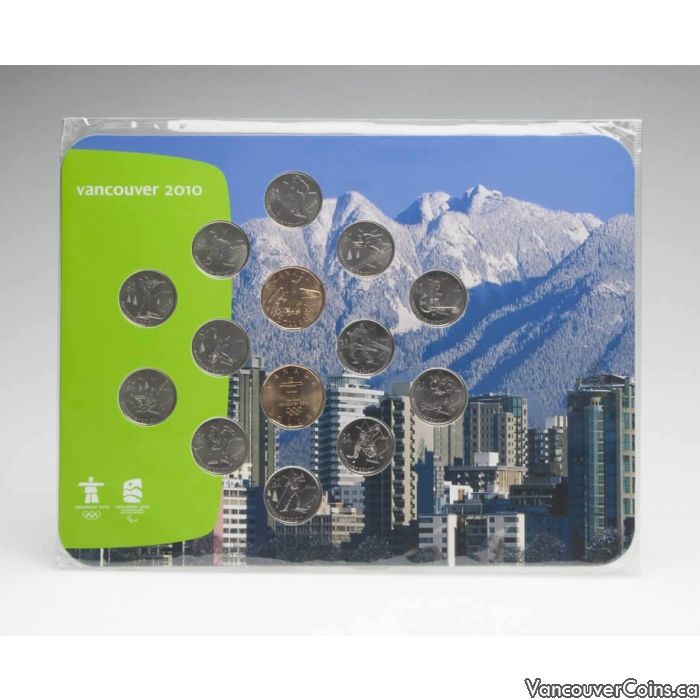 This is one of four different sets, which are presented in a card depicting various images unique to Vancouver and Whistler. The obverses and reverses of all 12 Vancouver 2010 quarters and the 2 Lucky Loonies are displayed on a beautiful card and each coin is protectively sealed to preserve its finish.