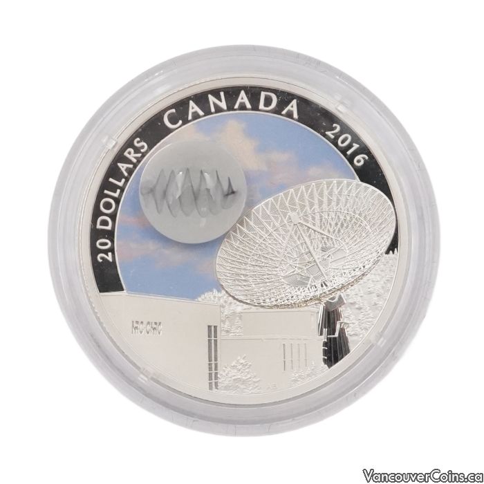 This 2016 $20 fine silver coin from the Royal Canadian Mint is part of The Universe series, featuring a stunning glow-in-the-dark design depicting a radio telescope under a starry sky with luminous elements that activate in the dark. The reverse showcases Canada's Dominion Radio Astrophysical Observatory with a meteor streak, highlighting themes of space exploration and astronomy. Encapsulated and presented in its original RCM box with certificate, this coin is in excellent condition as shown in the photos.