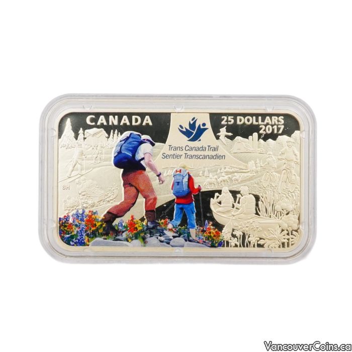 This 2017 $25 fine silver coin from the Royal Canadian Mint commemorates The Great Trail, also known as the Trans Canada Trail, featuring a colorful reverse design of hikers exploring Canada's vast landscapes. The obverse showcases Queen Elizabeth II on a unique patterned background, highlighting the coin's proof finish and rectangular shape. This collectible comes in its original capsule, red presentation case, and black outer box, making it a striking addition to any Canadian coin collection.