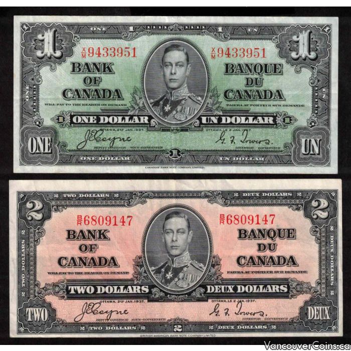 2x 1937 Canada banknotes $1 X/M9433951 & $2 B/R6809147 Coyne Towers VF+