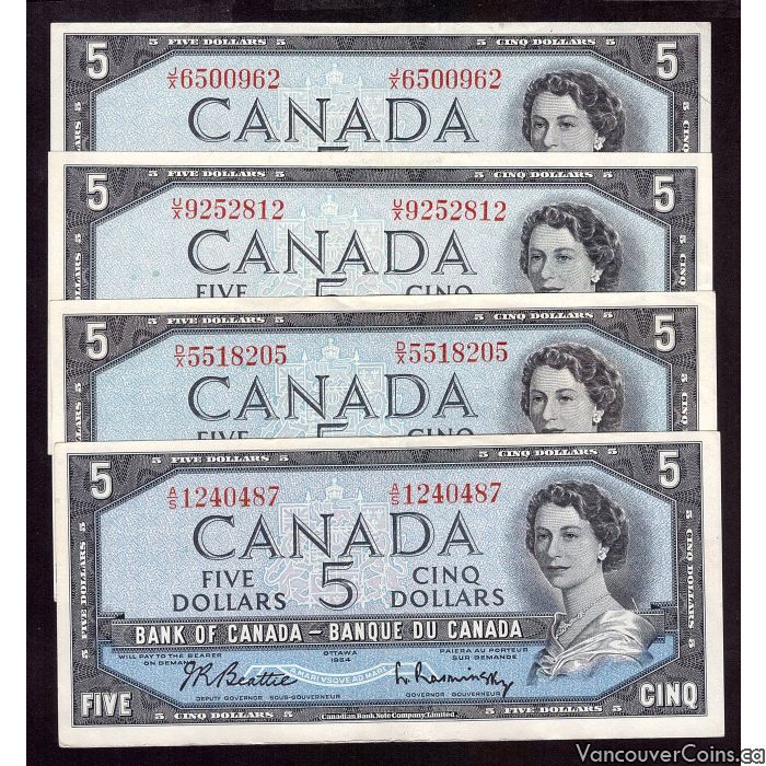 4x 1954 Canada $5 banknotes 4-notes Choice EF to Choice AU