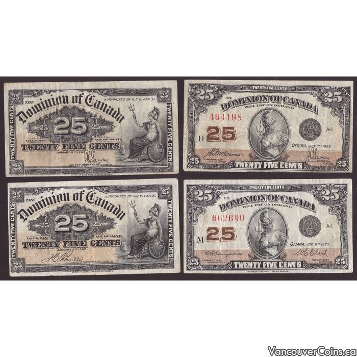 4x Canada shinplasters 1900 1923 4x different Canada 25c banknotes VF or better