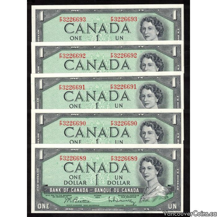 5 x Canada 1954 $1 consecutive notes Beattie Rasminsky F/P3226689-93 CH UNC