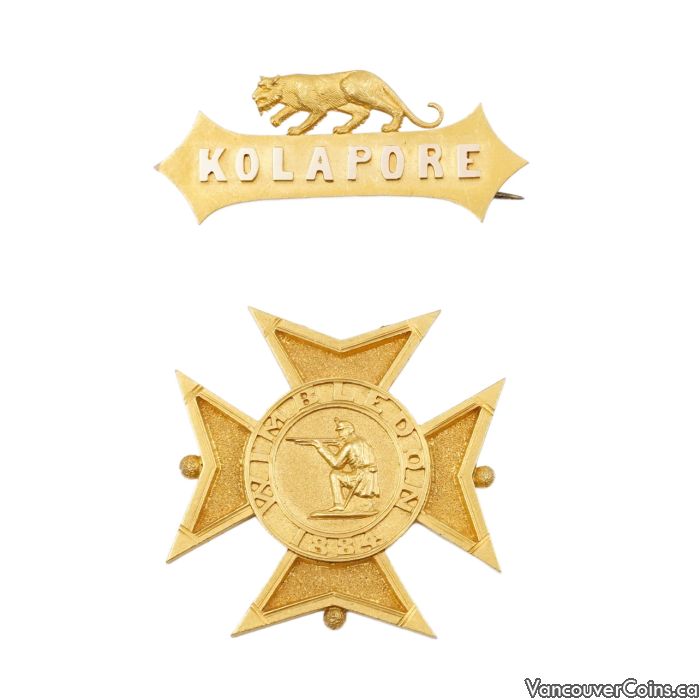 2.) a 15K solid gold Cross with the legend WIMBLEDON 1884 with a rifle Marksman in center.