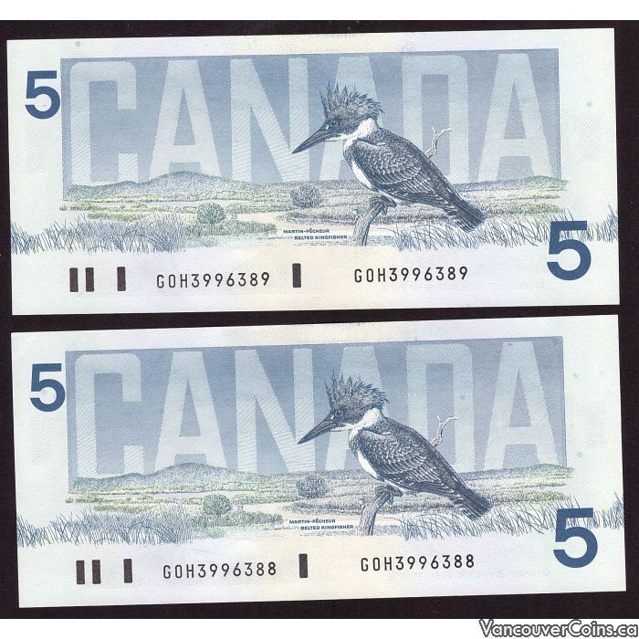 2x 1986 Canada $5 dollar consecutive banknotes Bonin GOH3996388-89 UNC63