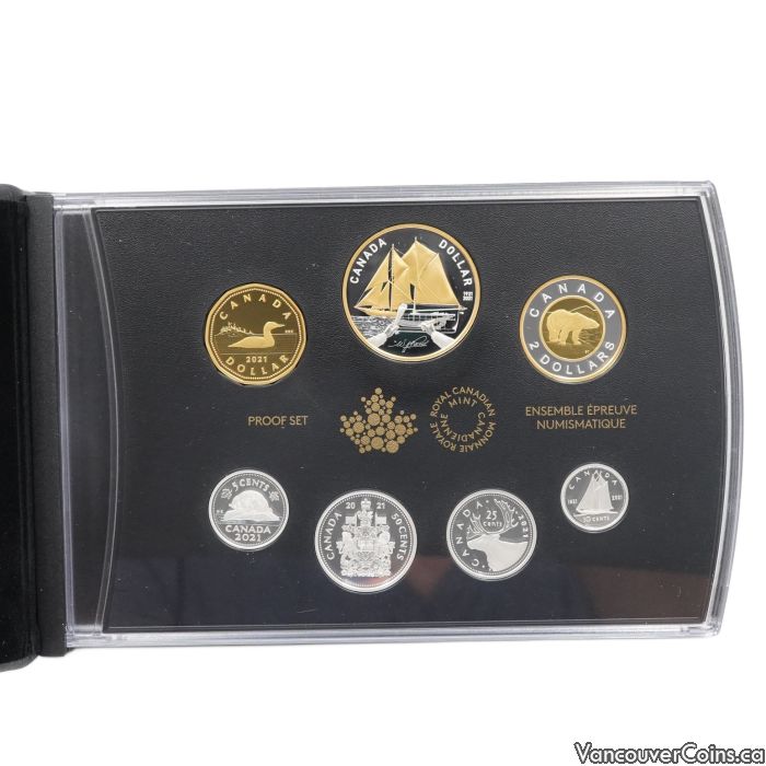 - Finish: Proof with gold plating on silver dollar and $2; silver-loonie fully gold-plated