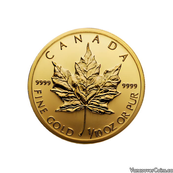 The 1/10th ounce Maple Leaf Gold Coin, minted by the Royal Canadian Mint.