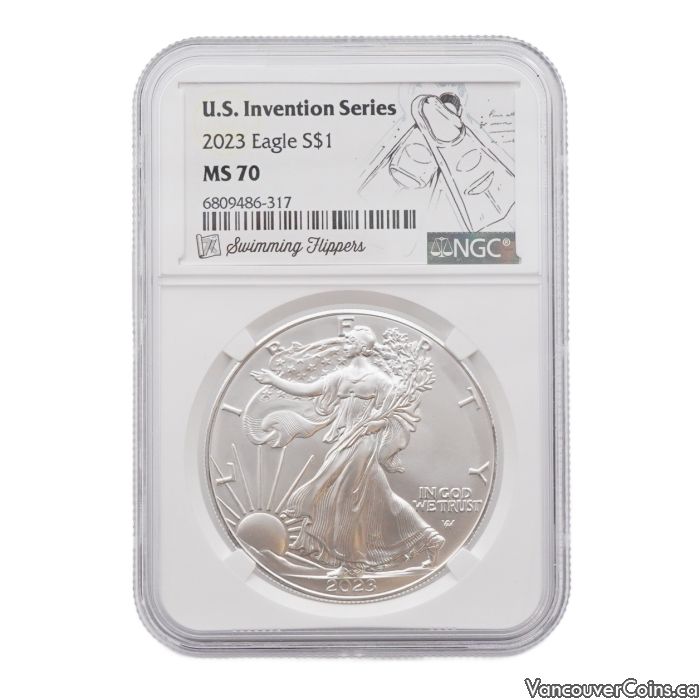 2023 American Silver Eagle MS70 NGC U.S. Invention Series Swimming Flippers Label | 1 oz .999 Fine Silver Coin