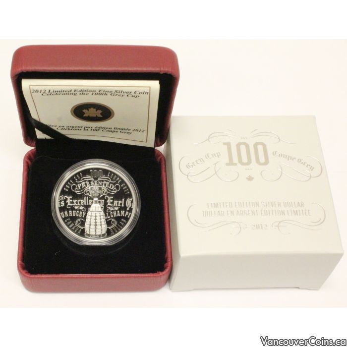2012 Limited Edition Grey Cup 100th Anniversary .9999 Silver Dollar Coin Royal Canadian Mint CFL Face Value Set - The set includes One(1) $1 Dollar .9999 Pure Silver coins Mintage: 10,000 Composition: 99.99% Silver Finish: Deep Cameo Mirror Finish Frosted Relief Packaging: This coin set comes with one pure silver coin packaged in a Royal Canadian Mint collector's display box with a certificate of authenticity and outer protective sleeve
