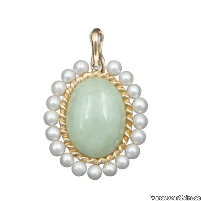 14K Yellow Gold Jadeite Pearl Pendant 6.75ct Jadeite 19 Pearls Oval Vintage