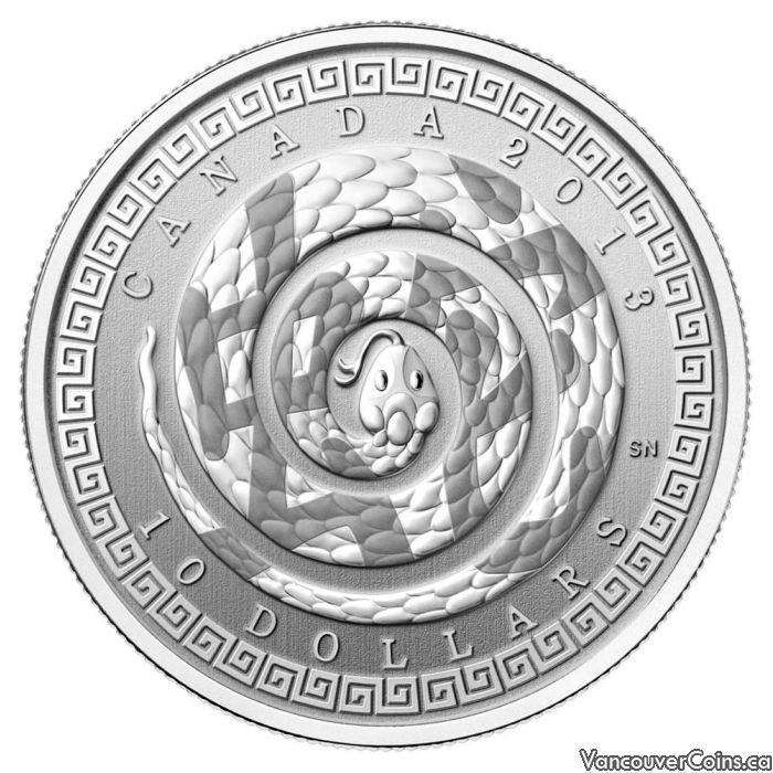 According to the Chinese Zodiac, the year 2013 is ruled by the Snake. This coin celebrates the unique heritage and ancient culture of Chinese Canadians.