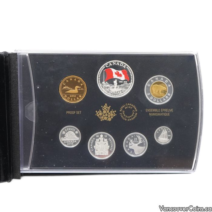 The 2015 Royal Canadian Mint Fine Silver Proof Set commemorates the 50th anniversary of the Canadian flag with silver-proof versions of all purchase coins. Each denomination struck in 99.99% pure silver includes a Proof Dollar coin featuring a colorized Canadian Flag design to mark the sesquicentennial of Canada’s emblem.
