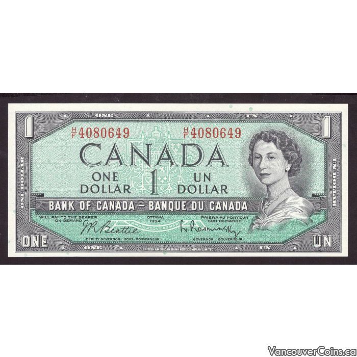 1954 Canada $1 banknote Beattie Rasminsky H/F4080649 Choice UNC