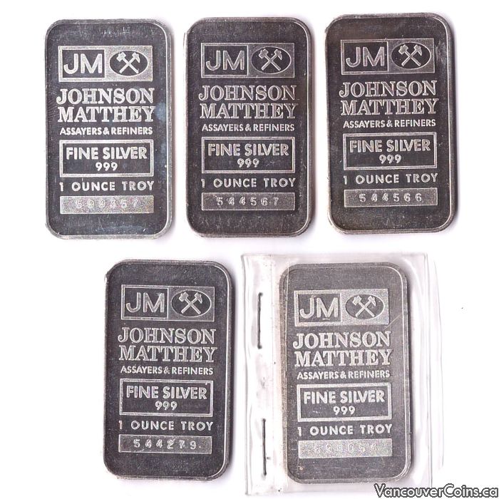 5x 1 oz JM Silver Bars Johnson Matthey 999 Fine Silver Bold Font