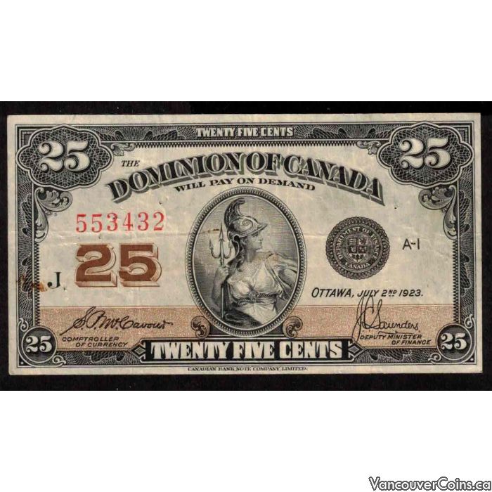 1923 Canada 25 Cent banknote McCavour Saunders 553432 DC-25c VF+