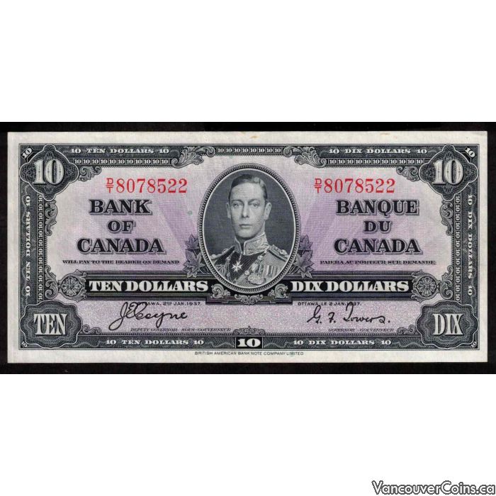 1937 Canada $10 banknote Coyne Towers D/T 8078522 Choice AU