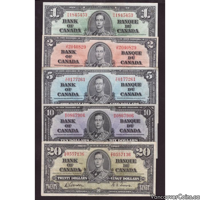 1937 Canada Banknote set $1 $2 $5 $10 $20 5-notes VF or better R/N1845453