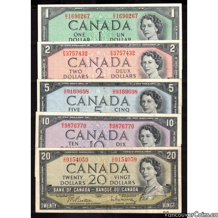 1954 Canada $1 $2 $5 $10 $20 banknote set 5-notes VF+ to EF+