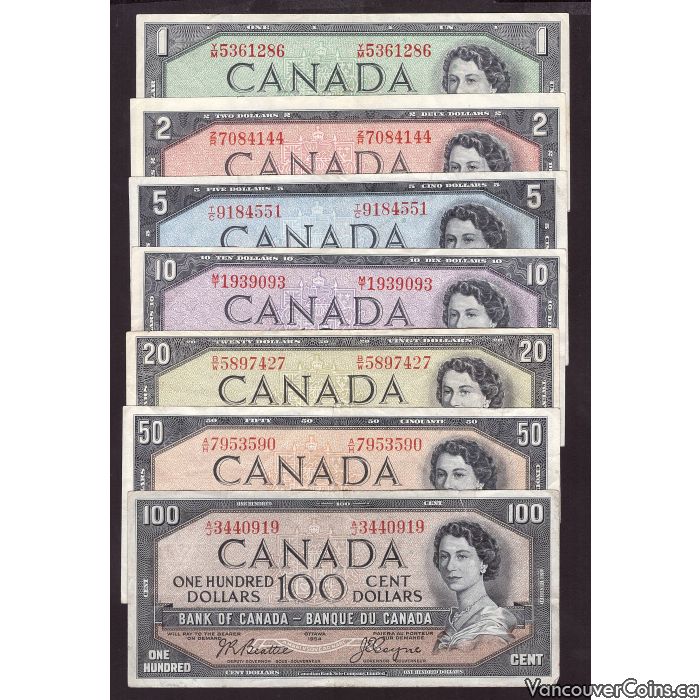 1954 Canada bank note set $1 $2 $5 $10 $20 $50 $100 7-notes F-VF+