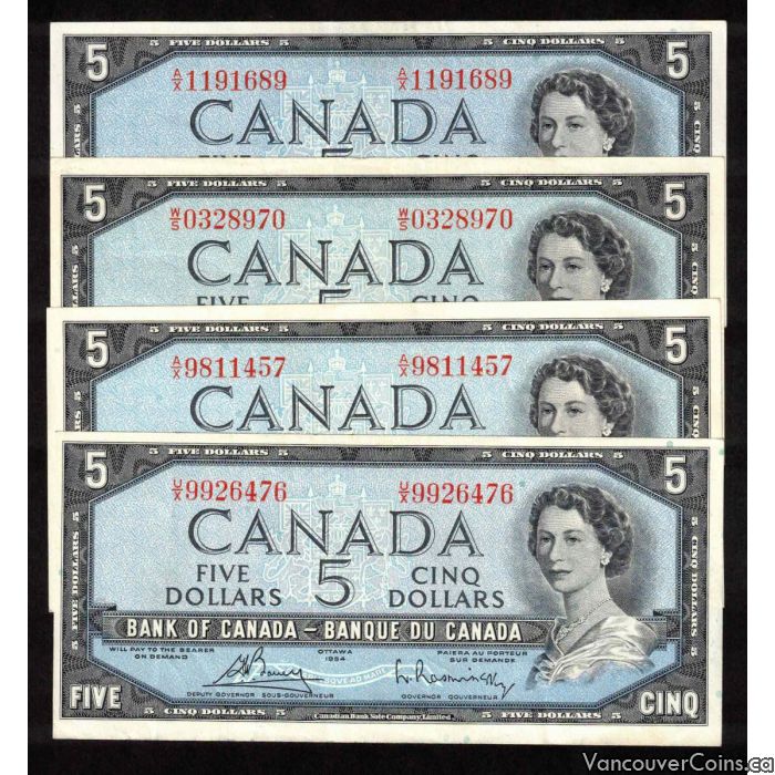 4 x Canada $5 banknotes Assorted prefix and signatures 4-banknotes EF+