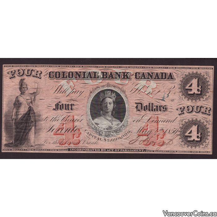 1859 Colonial Bank of Canada $4 banknote#41 UNC details 4-very small pinholes