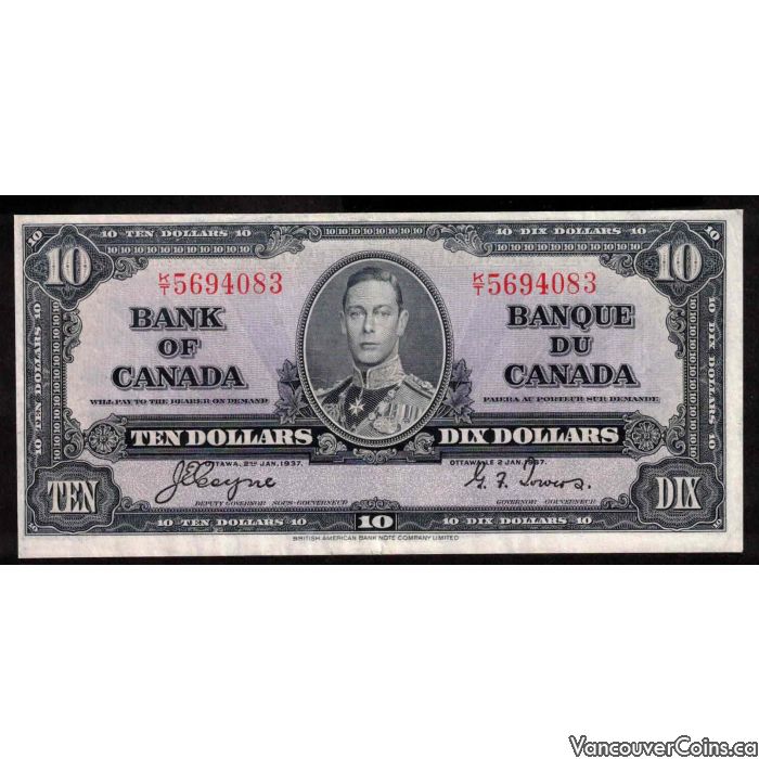 1937 Canada $10 banknote Coyne Towers K/T 5694083 nice EF+